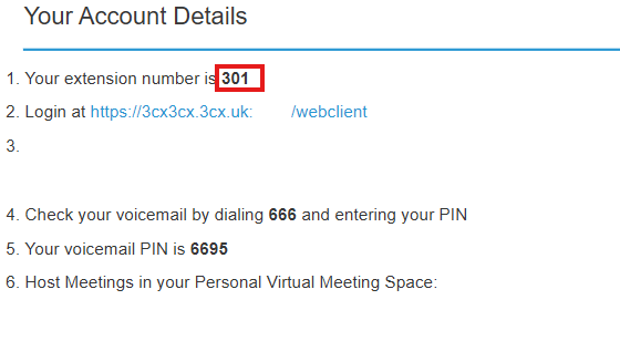 A "Welcome to 3CX" email should have been sent to your email address. Check your inbox for this email. This email contains your extension number and the link to the 3CX Web client - "Click Here" link. Make note of your extension number.