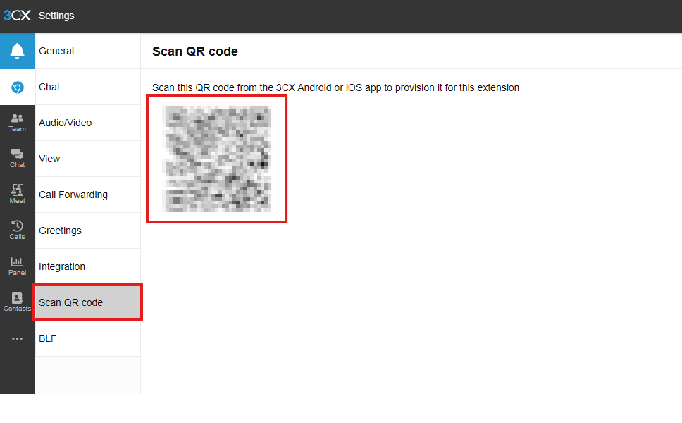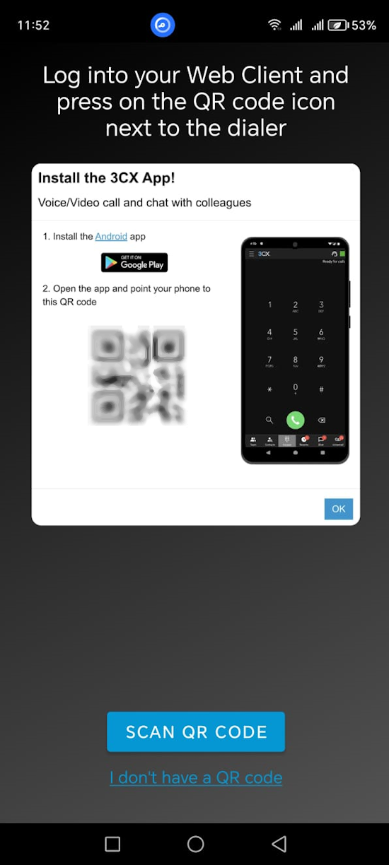 Click the scan QR code, the QR Should appear. Use your phone alongside the 3cx Mobile app to scan the code.