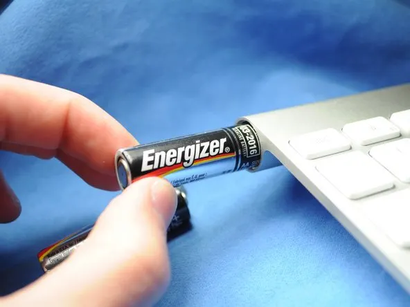 Caption: A new battery being inserted in the battery cover in a wireless keyboard.
