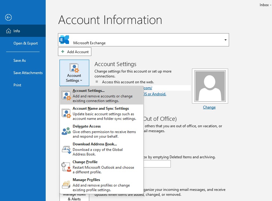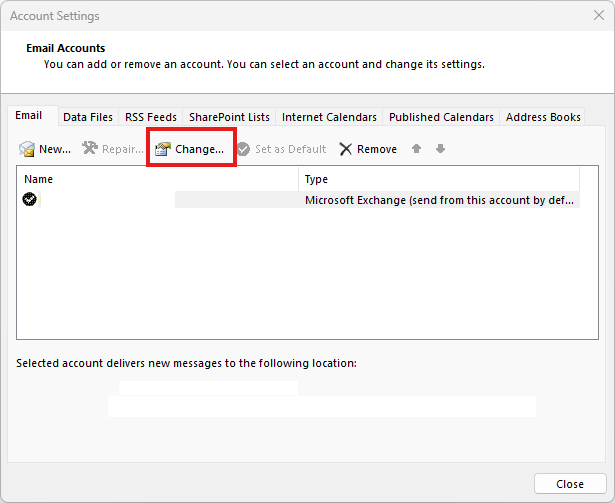 Select the File tab on the ribbon (top left), then select Account Settings > Account Settings.