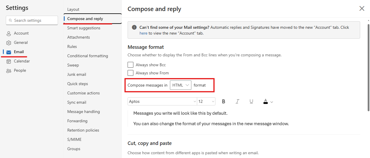 Go to Email > Compose and reply > Ensure Compose messages is set to HTML.