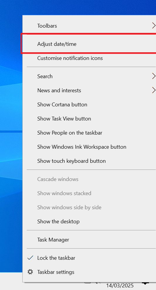 On the taskbar below the screen, right click the time and date. This will open a similar menu as in the image below. Click "adjust date/time".